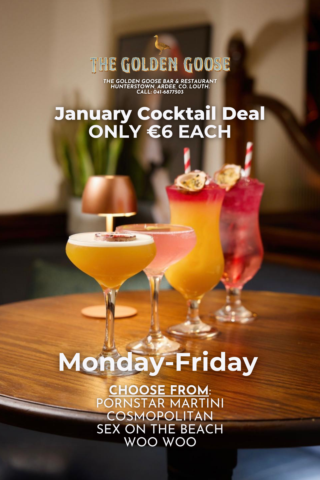 €6 COCKTAIL OFFER is available Monday-Friday. Bar opens 6pm Tuesday & Wednesday for Pool • Darts • Pints • Cocktails